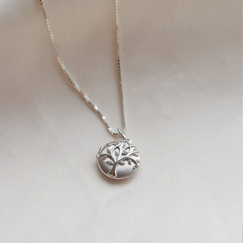 A refined and meaningful necklace featuring a Tree of Life locket in 925 sterling silver. The tree symbolizes strength, love, and life’s connections.