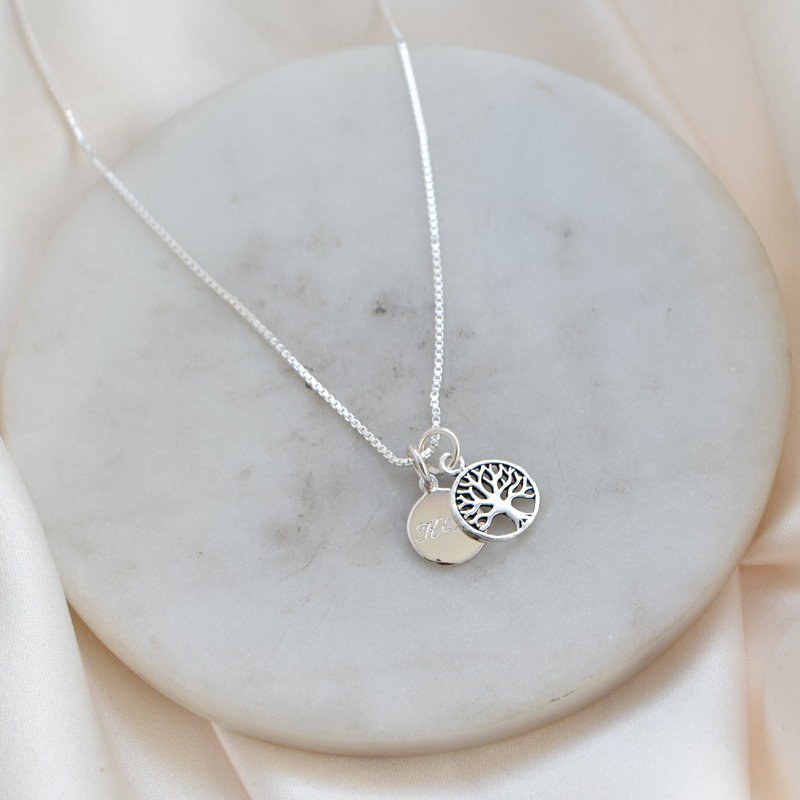 An elegant and personal necklace in sterling silver featuring a beautiful tree of life pendant combined with a classic amulet. The design blends symbolism and simplicity, with the tree of life representing strength, roots, and the connection between generations.