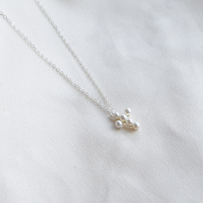 An elegant and feminine necklace in sterling silver featuring a beautiful cross pendant composed of delicate pearls. The Ethel necklace combines classic symbolism with a light and modern design, where the soft shape of the cross and the small pearls create a romantic and timeless look.