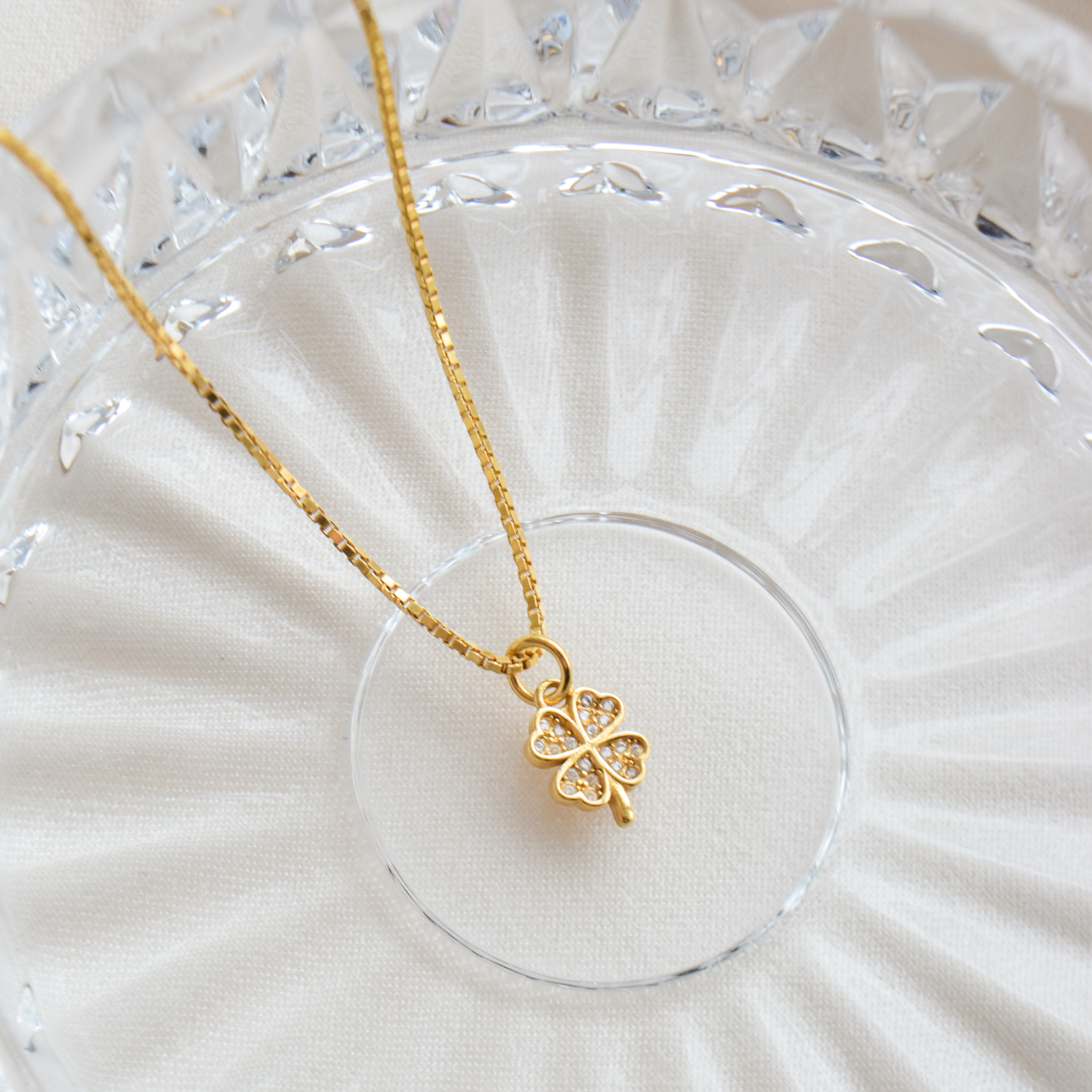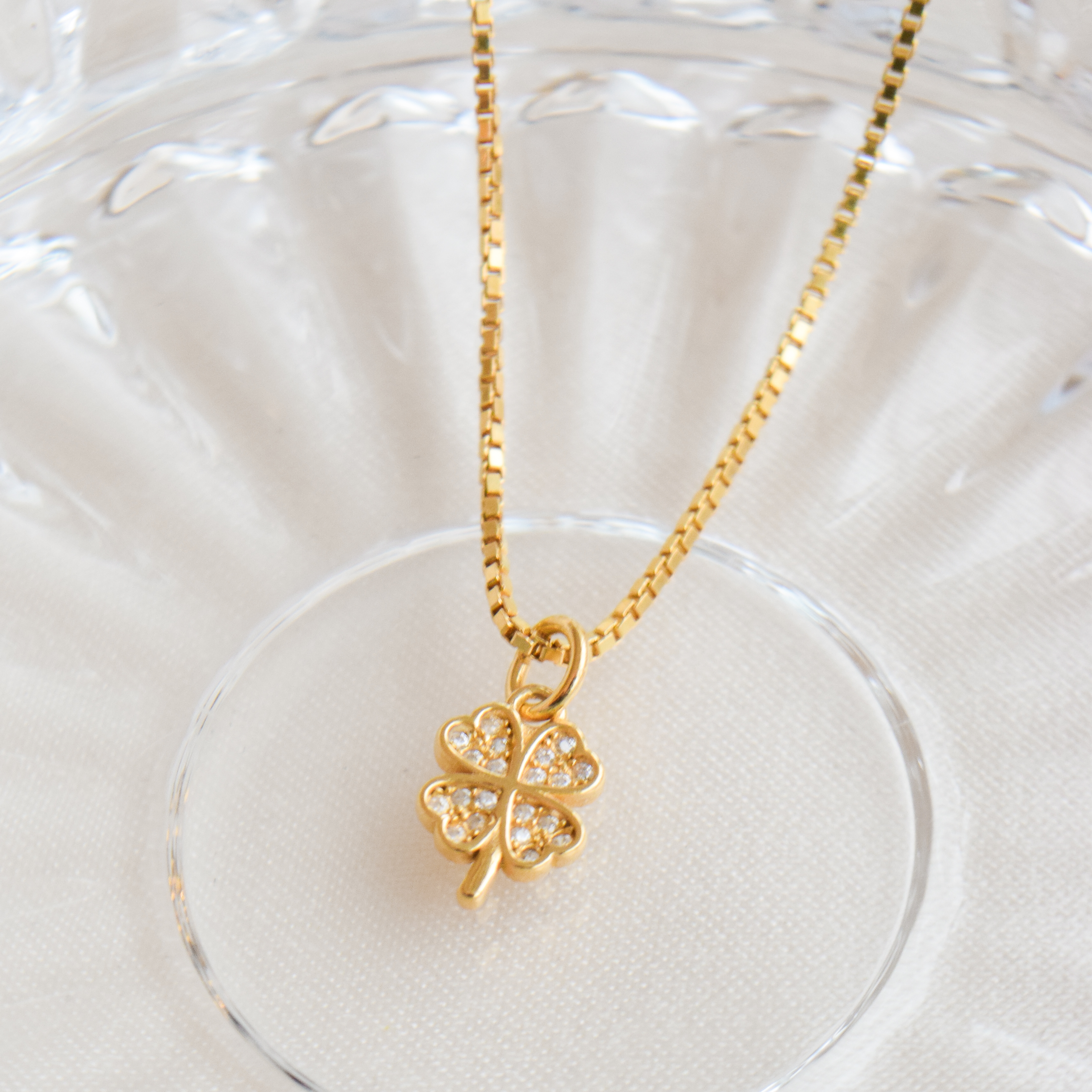 A nice and simple necklace with a four-leaf clover pendant. The pendant is decorated with small white stones that sparkle in the light.