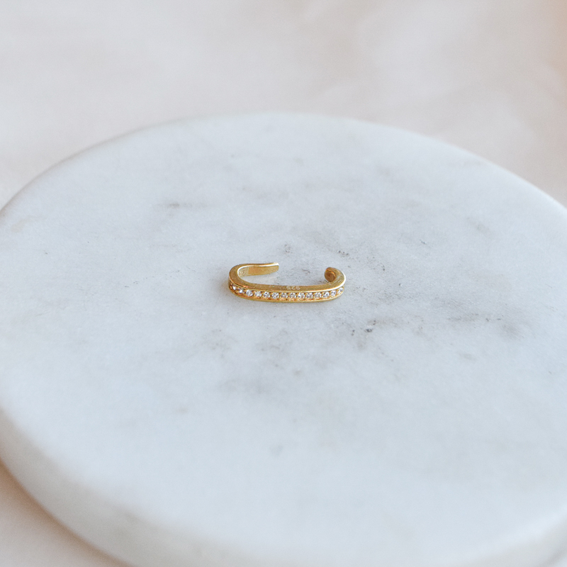The Kati ear cuff is a clean and timeless piece in 18k gold-plated sterling silver, decorated with a delicate row of clear zirconia. The minimalist design adds a subtle, exclusive sparkle and makes it perfect for both everyday wear and special occasions.