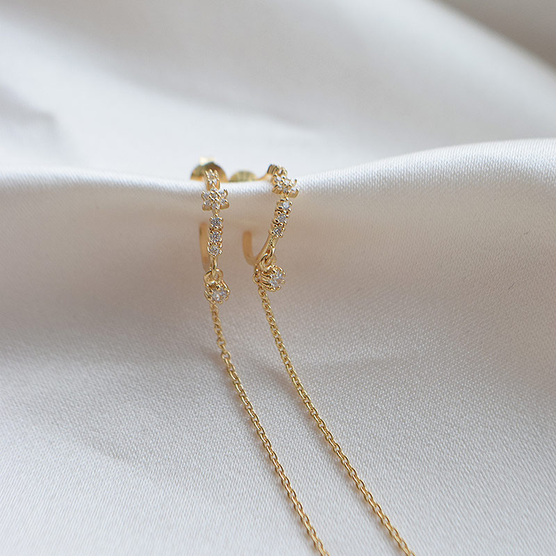 Rowena hoops in 18K gold plated sterling silver blend classic elegance with modern movement. Sparkling white zirconia line the hoop, finished with a delicate chain and stone drop for a refined, feminine look.