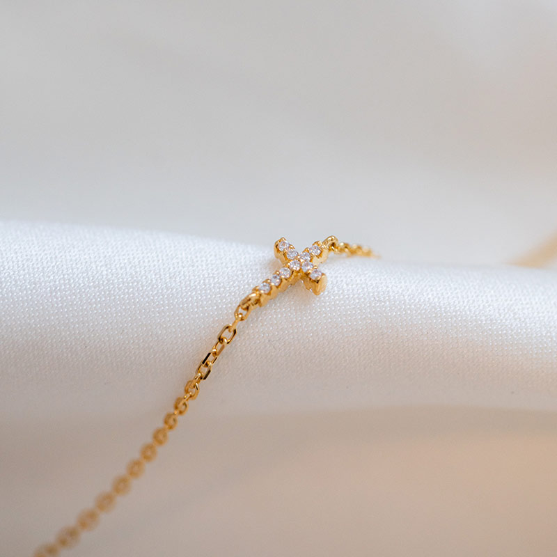 A delicate bracelet crafted in 18k gold plated sterling silver with a small cross set with sparkling cubic zirconia. Timeless and minimalistic, this bracelet is perfect for everyday wear or special occasions. A meaningful gift idea for confirmation, birthdays, or simply to treat yourself.