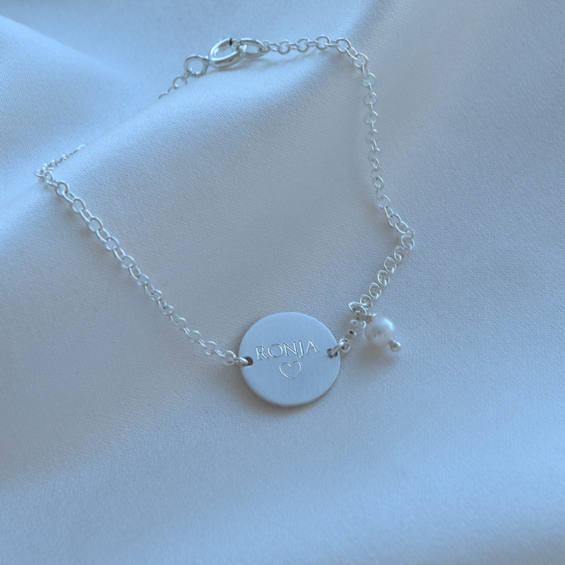 The bracelet is sterling silver, with a pretty chain and a round matt plate which will be personal engraved for you.