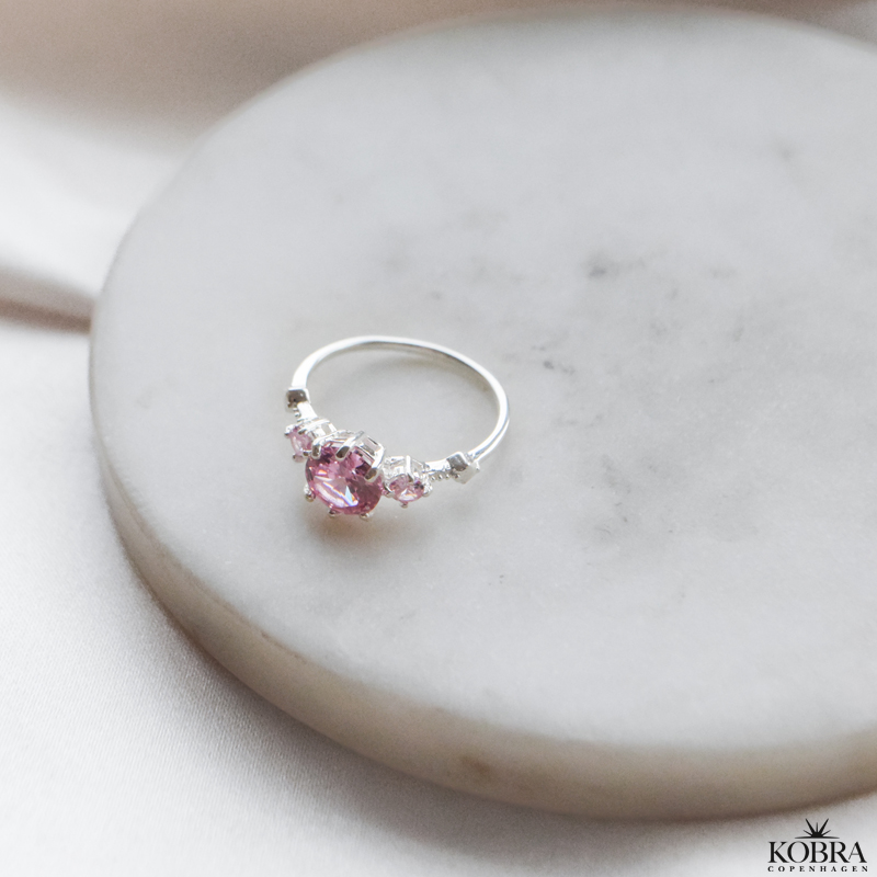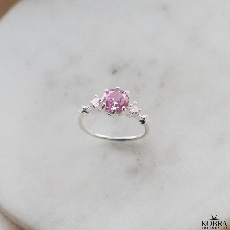 A beautiful and elegant ring with three pink zirconia stones that catch the light in the finest way.