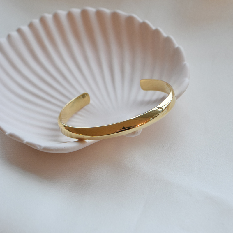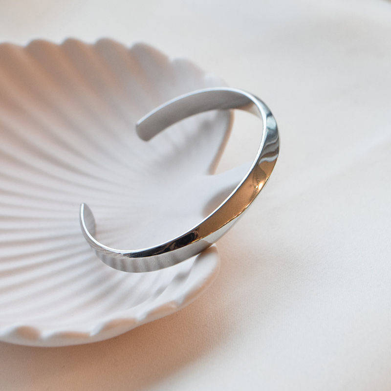 This bracelet is crafted in steel and is also available in 18 karat gold-plated steel. The surface is smooth and polished with a subtle raised line along the center, creating a slightly triangular profile that gives the bracelet a structured and graphic look.